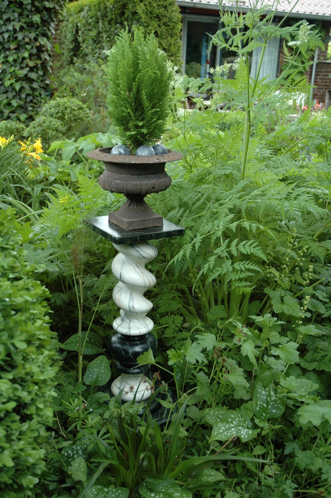 Den marmorerede piedestal i træ har været udlånt, og er nu vendt tilbage. Da vi gik og ordnede i haven, var det fristende at placere den derude i en romantisk leg for sjov.